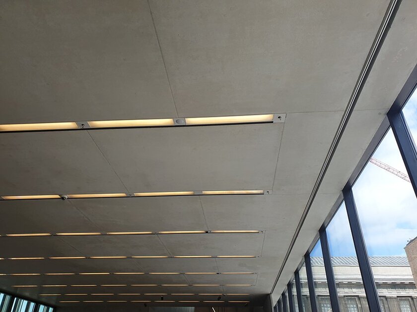 Due to the installation in the concrete, only the covers of the sprinklers, which were integrated into the light strips, can be seen in the ceiling area of the James Simon Gallery.
