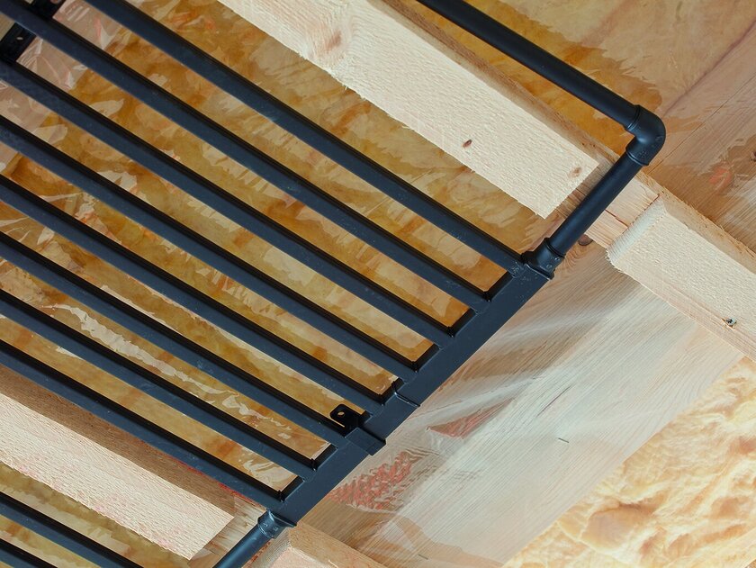 Therefore, the family was looking for a heating system that can be adapted very flexibly to the spatial conditions. The result of their search: aquatherm black. In conjunction with an oil-fired condensing boiler, the surface heating system, which can also be used for cooling, is used throughout the building; it can be easily controlled using a smart home solution. In the basement of the main house, which contains a living and dining room and kitchen, aquatherm black was attached to the ceiling. Thanks to its low construction height, which is only 24.5 millimetres including collectors, mounting rails and connections, the loss of ceiling height is minimal and does not lead to any restrictions.