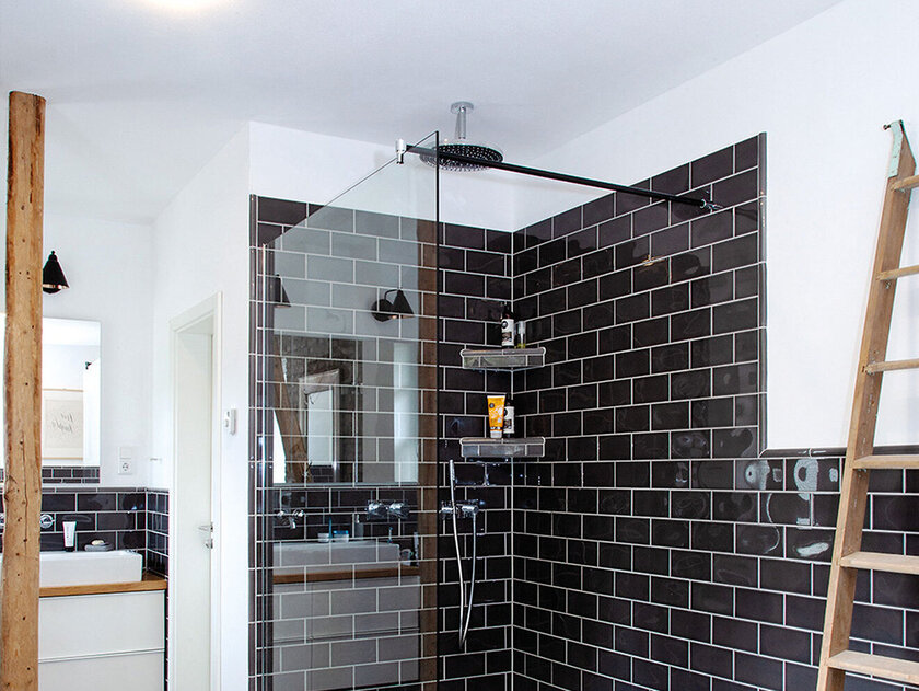In the bathroom, a special solution was chosen: The black grids were integrated into the shower and thus provide cosy warmth when entering the wet cell. The installation took place on two sides of the shower screen.