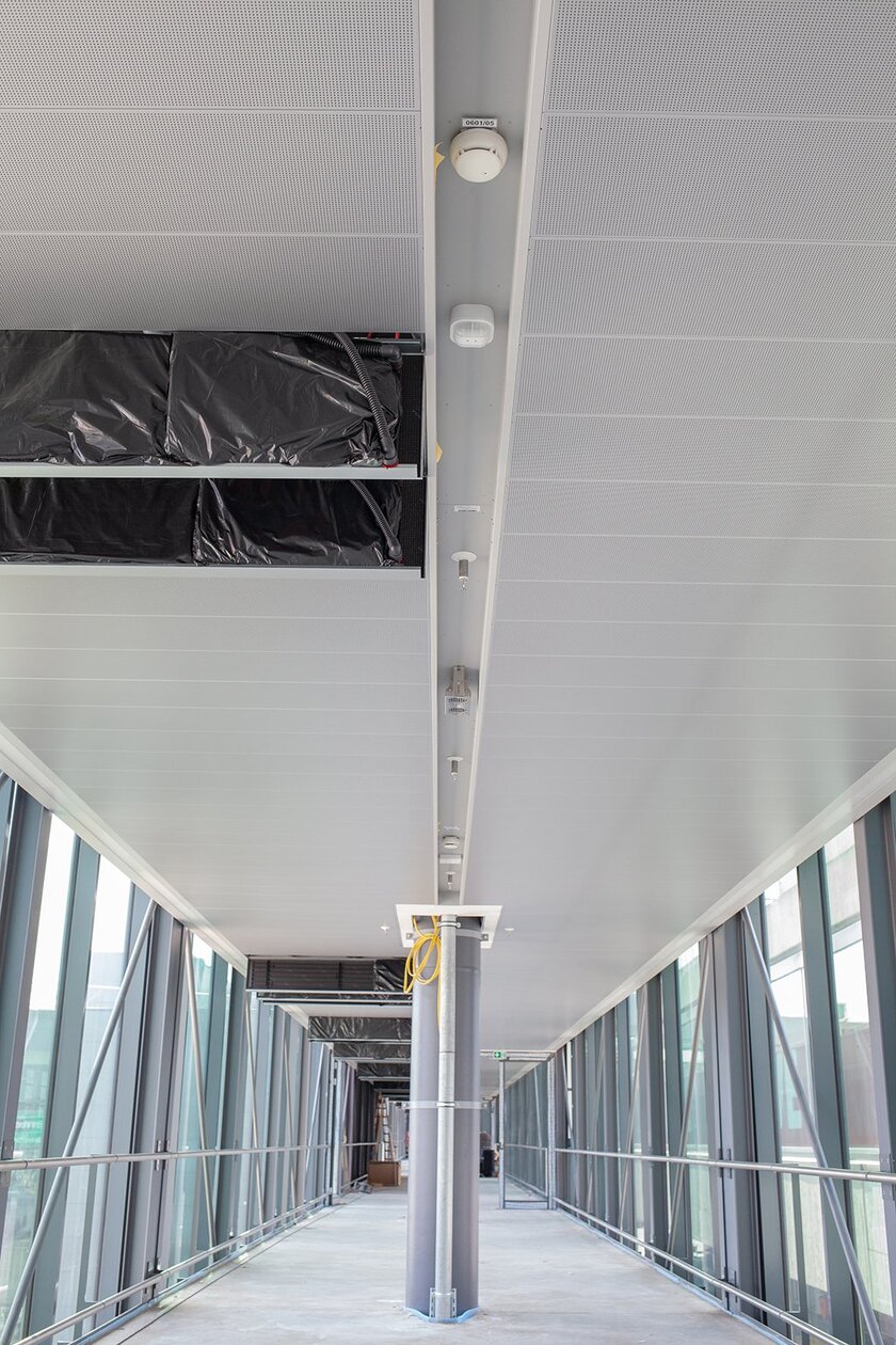 Therefore, he was looking for an effective cooling system that could cover the entire range of cooling requirements. In the context of earlier building projects, for example the housing estate HUF City Living in Montabaur and the renovation of the fire brigade control room of the airport Cologne/Bonn, he had got to know and appreciate the surface heating and cooling system . Therefore he also decided to use the aquatherm product for the new connecting corridor, which was installed in a perforated metal cassette ceiling and connected to an already existing district cooling network.