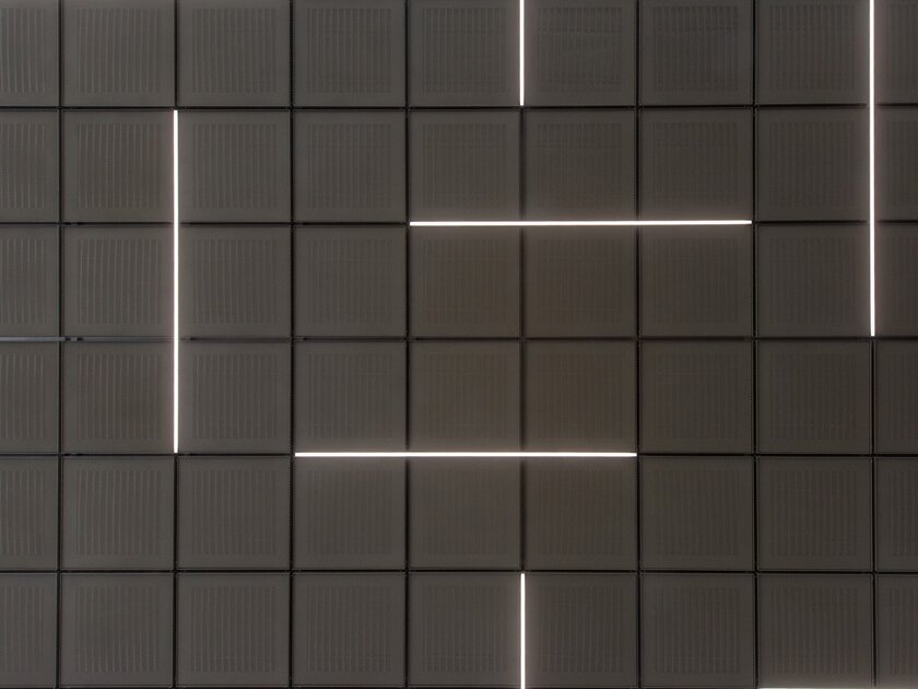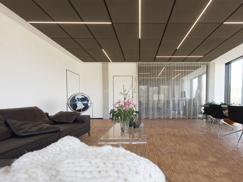 The special design is also continued in the interior. When it came to the ceiling design, standard products were out of the question for Sandra and Ingo Gramm. “The market did not offer us a ceiling system that met our quality requirements,” says Sandra Gramm. That’s why Mr. and Mrs. Gramm developed their own expanded metal ceiling: bronze-colored like the Mikado bars on the exterior façade, it fits perfectly into the concept. “We attach great importance to sustainability and set high standards visually, which is why our ceiling is characterised not only by its unique technology, but also by its modern and changeable design,” explains Sandra Gramm. “Technical highlights are the exact cross joints with the smallest tolerance and an individual hanging system where you can unhinge each cassette individually.” LED light strips are integrated flush into the joints and the edge pieces of the ceiling were realized by edge friezes, in which slots for the supply air find place. The edge friezes provide a seamless transition, which eliminates fitting pieces. “Furthermore, our ceiling provides an open system for exhaust air, with no visible exhaust ports.”