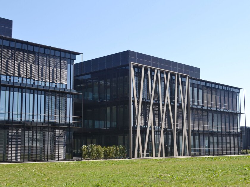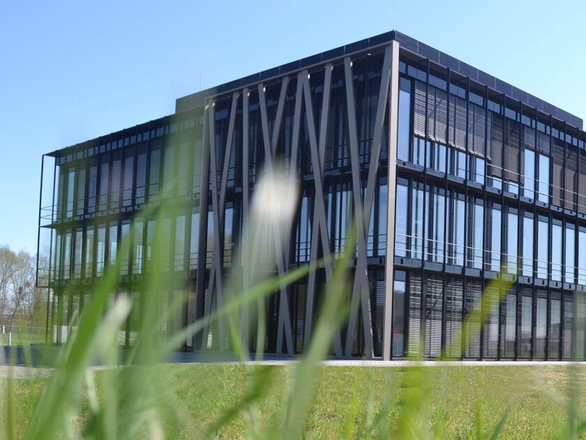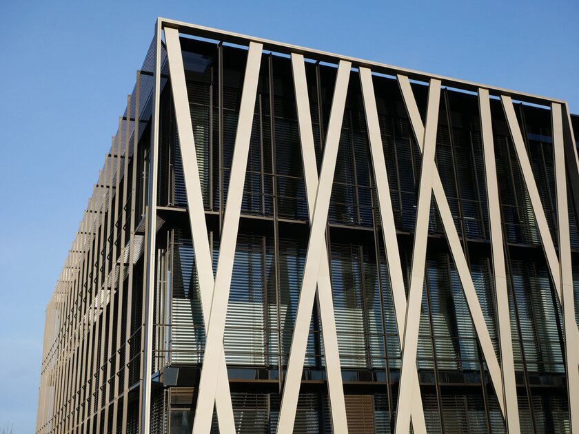 The unusual façade gives the building project its name: bronze-coloured struts on the glass façade, placed randomly at first glance, are reminiscent of the game of skill Mikado. They reflect the points of contact between people in their daily work and the promotion of the ability to concentrate. As individual as each Mikado litter, the intelligent room concept is always variable and can be adapted to the respective needs. The generous glass façade allows light to enter and provides views of orchards and, with a good view, across the nearby Lake Constance to the Alps.