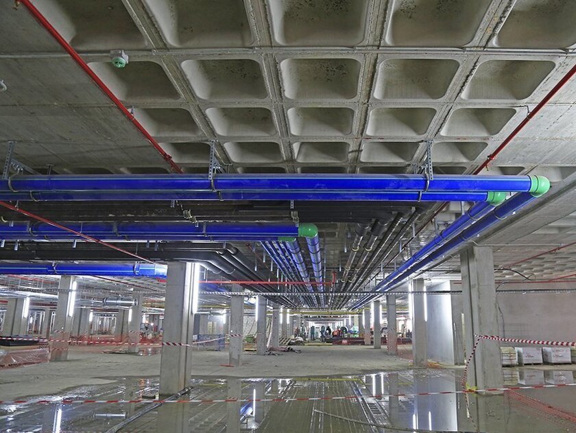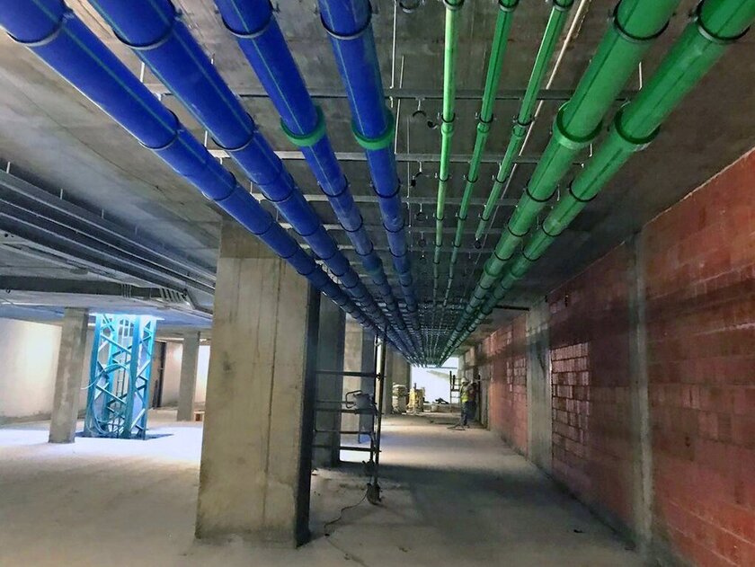 For the piping of the fan coils, which are used throughout the building for air conditioning, the planners decided on aquatherm blue. Around twelve kilometers of the pipe were used to ensure the smooth operation of the air conditioning system for many decades.