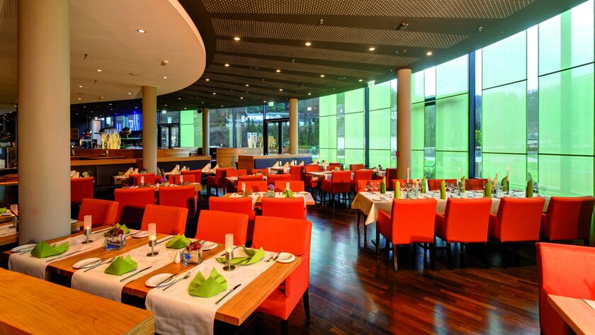 La planta baja alberga un restaurante de cocina internacional, además de la zona de recepción. El restaurante invita a los huéspedes a un viaje culinario alrededor del mundo y también está abierto a clientes ajenos al hotel, al igual que la discoteca a una hora más tardía. Los huéspedes pueden recargar las pilas al día siguiente en la zona de spa con dos saunas, baño de vapor, cabina de infrarrojos, sala de relajación de sal y bancos de calor. Una zona al aire libre en la terraza de la azotea del hotel ofrece el marco ideal para relajarse en paz tras un día lleno de acontecimientos. Una zona de fitness y una cervecería al aire libre con 150 plazas completan la oferta.