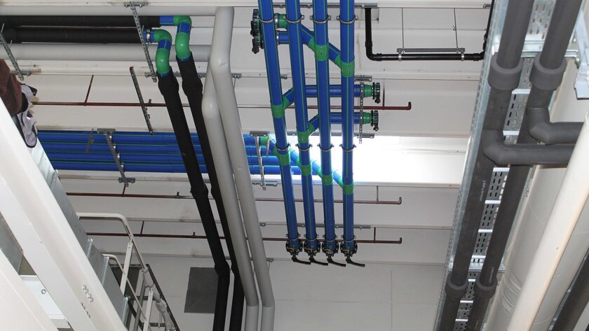 In verschiedenen Gebäudekomplexen kamen insgesamt rund 5000 Meter des faserverstärkten Rohrleitungssystems aquatherm blue in Dimensionen von 32 bis 450 mm zum Einsatz. „Mit aquatherm haben wir einen Partner gefunden, auf den wir in allen Bereichen der Rohrleitungen vertrauen können“, erklärt Markus Egetenmeier, Leiter des Bereichs Facility Services bei VARTA. „Das Material ist für den Einsatz der Kälte- und Vakuumleitungen hervorragend geeignet und die Auswahl der Dimensionierung bis 500 mm für uns ideal.“