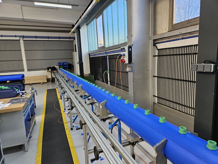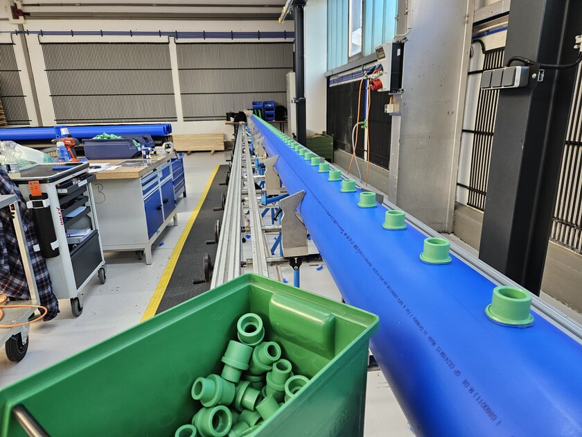 Ein besonderes Highlight des Systems ist der Hauptverteiler, der von aquatherm über den niederländischen Partner ERIKS vorgefertigt geliefert wurde. Der Verteiler – mit Durchmessern bis zu 200 mm und einem Gesamtgewicht von über zwei Tonnen – wurde am aquatherm Hauptsitz in Attendorn komplett vormontiert und für die direkte Installation vorbereitet. Diese enge Zusammenarbeit zwischen aquatherm, ERIKS und RIHO war entscheidend, um die Montagezeit vor Ort zu minimieren. Schließlich musste der Kühlboden im engen Zeitfenster zwischen den Saisons fertiggestellt werden. Auch die Rohrbögen – die Verbindungen zwischen Vor- und Rücklaufleitungen – wurden teilweise von RIHO in der eigenen Werkstatt im niederländischen Vorden vorgefertigt.