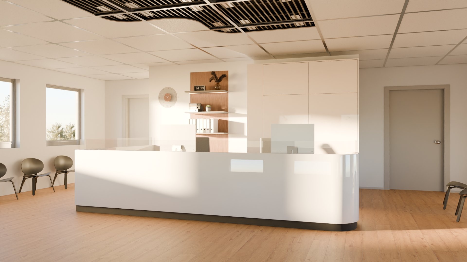 - Hohe Schallabsorption bei den Deckenplatten mit Lochung und Akustikvlies,