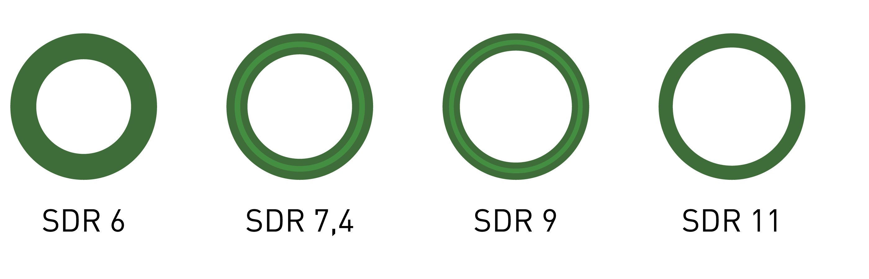 Der SDR (Standard Dimension Ratio) ist eine Kennzahl zur Angabe der Druckbeständigkeit. Um eine gewisse Druckbeständigkeit zu gewährleisten, ist, je nach Materialart, eine bestimmte maximale SDR-Zahl notwendig. Es gilt: Je größer die Wandstärke, desto kleiner die SDR-Zahl und desto druckbeständiger das Kunststoffrohr. Die Einheit gibt das Verhältnis zwischen Außendurchmesser und Wanddicke eines Rohres an. aquatherm green ist in folgenden SDR-Größen erhältlich:
