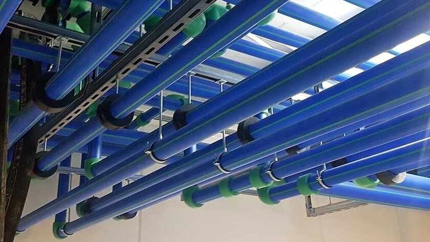 Nicht nur wurde die gesamte Kältezentrale mit dem Rohrleitungssystem aquatherm blue aus dem korrosionsbeständigen Werkstoff Polypropylen in Dimensionen zwischen 32 und 200 mm ausgestattet, sondern zusätzlich wurden die Anschlussverteiler am aquatherm Hauptsitz im südwestfälischen Attendorn hergestellt. Insgesamt wurden hier sechs Einzelverteiler zwischen drei und sechs Meter Länge und bis zu 2,20 Meter Höhe gefertigt. Diese lieferte aquatherm einbaufertig in elf Teilstücken zur Baustelle, dort mussten sie nur noch zusammengesetzt werden. Auch die Zuleitungen zu den zwölf Wärmetauschern wurden vorgefertigt und passgenau geliefert.