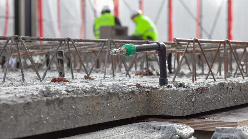 aquatherm black wurde nach Kundenwunsch in Größen von 24 cm x 60 cm bis 48 cm x 500 cm im Hauptwerk der aquatherm Unternehmensgruppe im südwestfälischen Attendorn objektspezifisch produziert. Insgesamt kamen 97,4 m² Register zum Einsatz. Dies entspricht einer Belegung im Objekt von rund 60 Prozent und damit einer geringen Belegfläche, die trotzdem ausreichend ist, um das Gebäude effektiv zu beheizen und zu kühlen. Die Register wurden bereits werkseitig mit einem optischen Dichtheits-Kontrollsystem ausgestattet. So mussten sie bei der Firma Lütkenhaus nur noch in die zu gießenden Fertigteildecken eingelegt werden. Die Register wurden speziell in den Filigrandecken angeordnet, sodass eine Bohrtiefe von rund 2,5 cm für spätere Installationsmöglichkeiten gewährleistet werden konnte. Dies ermöglicht ein problemloses Anbringen von zum Beispiel Lampen oder C-Profilen von Trockenbauwänden. „Durch den funktionellen Aufbau von aquatherm black mit geringem Verlegeabstand und harfenförmigem Aufbau kann im Heiz- sowie Kühlbetrieb die thermische Energie gleichmäßig und effizient übertragen werden, sodass hohe Heiz- und Kühlleistungen mit geringem Druckverlust erzielt werden. Dadurch können die Wärme und Kälte gleichmäßig verteilt werden. Somit erzielen wir in Verbindung mit dem geringen Druckverlust des Systems hohe Heiz- und Kühlleistungen“, erklärt Anastasios Barbas, Chief Product Officer von aquatherm. Später auf der Baustelle mussten die einzelnen Fertigteildeckenelemente nur noch miteinander verbunden werden, die Verbindung der aquatherm black Register erfolgte durch die Heinrich Kriener GmbH & Co. KG aus Beckum.
