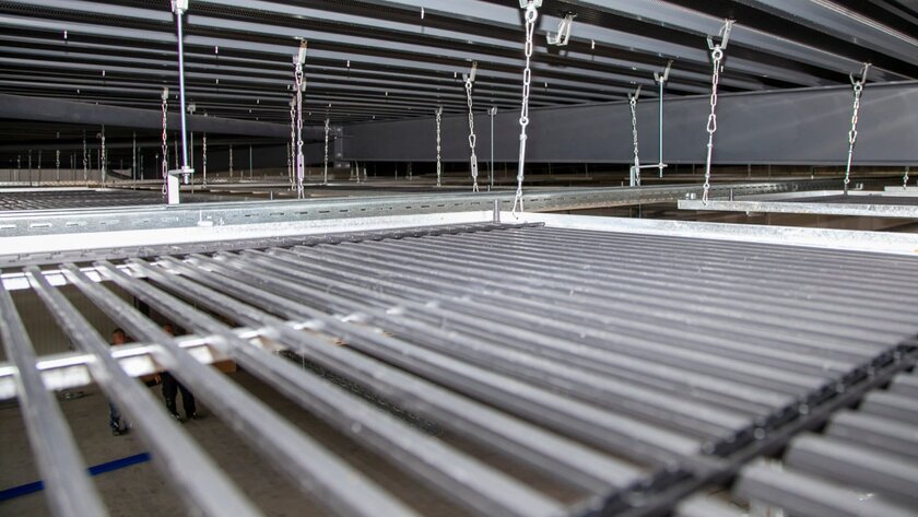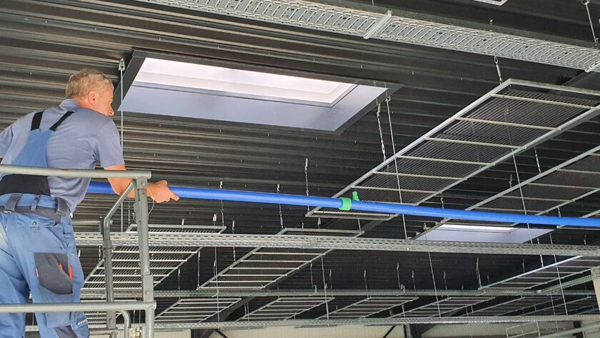 Der Haustechnikgroßhändler entschied sich dafür, aquatherm black sichtbar auf von der mit schwarzem Trapezblech verkleideten Hallendecke abgehängte Stahlrahmen zu montieren. Durch diese Montageart wird eine höhere Effizienz und Reaktionsschnelligkeit als zum Beispiel bei der Montage als Deckensegel oder in einer geschlossenen Decke erzielt, weil neben einem hohen Strahlungsanteil hinsichtlich der Wärmeübertragung auch der konvektive Anteil steigt. Die aquatherm black Register wurden nach Kundenwunsch in einer Größe von 1 x 3,75 m im Hauptwerk der Unternehmensgruppe aquatherm objektspezifisch produziert und in insgesamt 35 Stahlrahmen eingebracht. Für die ausführende Firma Börger aus Lennestadt, die seit über 20 Jahren aquatherm Produkte verarbeitet, war es das erste Projekt mit dieser Montageart.