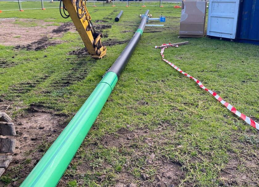 Eine Herausforderung des Projekts war es, ein geeignetes Rohrleitungssystem zu finden, welches das geothermische Heizwasser mit Vor- und Rücklauf über erdverlegte Rohrleitungen transportiert. Dementsprechend ist es wichtig, dass das Rohrmaterial für die Erdwärmebeheizung geeignet ist, d.h. es muss die Förderung von 68°C warmen Wasser in Verbindung mit einem Wasserdruck von max. 10 bar bei einer berechneten Lebensdauer von 50 Jahren standhalten können. Zudem sollte es über diesen Zeitraum korrosions- und chemischbeständig gegenüber den verschiedenen Mineralien im Bohrwasser sein. Hinzukommt, dass das System eine gute Isolationseigenschaft und damit eine niedrige Wärmeleitfähigkeit vorweisen muss und flexibel sein sollte.