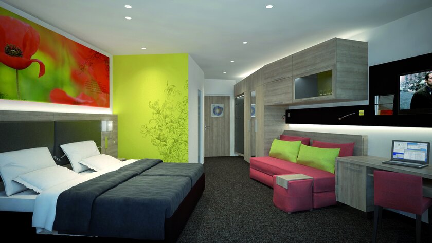 Temperiert wird das Hotel durch das Flächenheiz- und Kühlsystem aquatherm black. Installiert sowohl an der Außenfassade als auch in den Aufenthaltsräumen sowie den Zimmern in Wand und Decke sorgt es für Wärme im Winter und Kühle im Sommer. Auch die neue Bowlingbahn, die sich im Untergeschoss des Gebäudes befindet, sind mit aquatherm black ausgestattet. 80 Elemente a 220 x 34 cm wurden entlang der beiden Seitenwände angebracht. Die schwarzen Register aus korrosionsbeständigem Polypropylen sorgen durch einen gleichmäßigen Strahlungsaustausch mit den Raumumfassungsflächen für eine optimale Raumtemperatur. Zugluft oder Staubaufwirbelungen sind durch diesen Prozess ausgeschlossen. Durch den geringen Verlegeabstand der Registerrohre und der dadurch erzielten quadratmeterbezogenen hohen Flächendichte von aquatherm black, kann das System mit niedrigeren Vorlauftemperaturen als konventionelle Heizsysteme betrieben werden und ermöglicht in Verbindung mit seiner schnellen Reaktionsfähigkeit einen besonders effizienten und energiesparenden Betrieb.