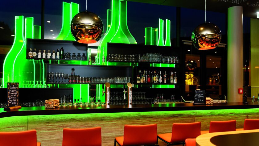 Im Erdgeschoss ist neben dem Empfangsbereich ein Restaurant mit internationaler Küche untergebracht. Letzteres lädt zur kulinarischen Weltreise ein und ist auch für Nicht-Hotelgäste geöffnet - ebenso wie zu späterer Stunde die Tanzbar. Neue Energie können die Gäste am nächsten Tag tanken: Die Saunalandschaft mit zwei Saunen, Dampfbad, Infrarot-Kabine, Salz-Ruheraum, Wärmebänken und einem Außenbereich auf der Dachterrasse des Hotels bietet den idealen Rahmen, um nach einem ereignisreichen Tag in Ruhe zu entspannen. Ein Fitnessbereich sowie ein Biergartenmit 150 Plätzen runden das Angebot ab.
