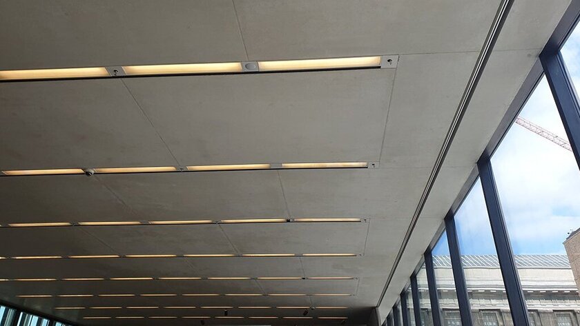 Die Verschweißung von Rohr und Fitting sorgt darüber hinaus für eine zu 100 Prozent dichte Verbindung. Durch die Verlegung im Beton sind im Deckenbereich der James-Simon-Galerie lediglich die Abdeckungen der Sprinkler zu sehen, die in die Lichtbänder integriert wurden.