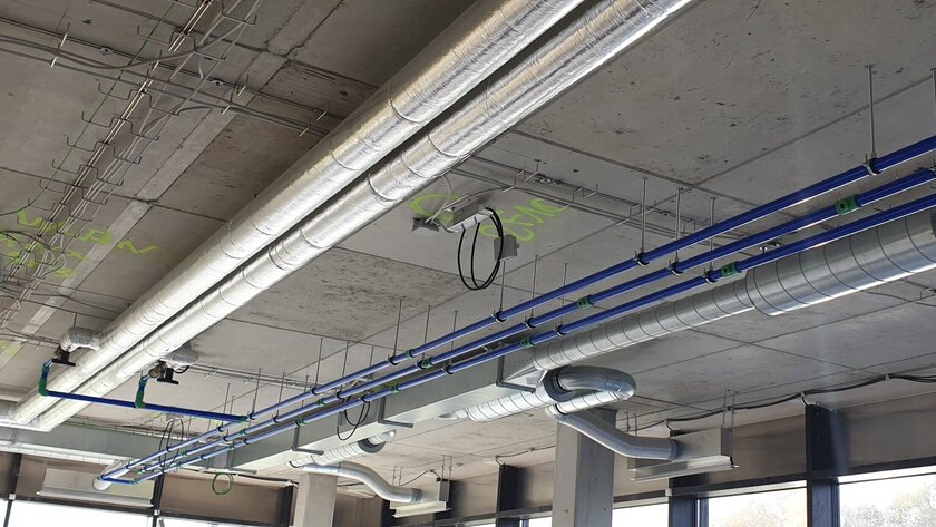 Die Anbindung des Flächenheiz- und Kühlsystems wurde über eine Tichelmann-Verteilung aus aquatherm blue-Rohren realisiert. aquatherm blue, ebenfalls aus dem Kunststoff Polypropylen gefertigt, ist ein Spezialist für den Transport von kühlenden und heizenden Medien in geschlossenen Systemen und eignet sich deshalb besonders gut für verschiedenste Industrieanwendungen.