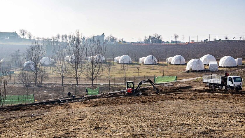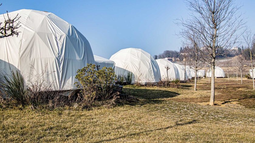 In dieses Konzept passt das neueste Projekt von „Orsolina28“ hervorragend hinein: Inmitten der Weinberge wird für die Gäste ab sofort ökologisches „Glamourous Camping“, kurz Glamping, angeboten. Auf einem modernen Campingplatz sind permanente Zelte entstanden, die in Anlehnung an die geometrische Form der Erde als Kuppeln gestaltet wurden. Die Gäste haben die Möglichkeit, unter freiem Himmel zu leben und übernachten, ohne auf Komfort verzichten zu müssen. Die 28 Zelte für 4 (20 m²) oder 6 Personen (37 m²) sind mit Kühl- und Heizungsluftanlagen, WIFI-Anschluss, Steckdosen und Sanitäranlagen eingerichtet.