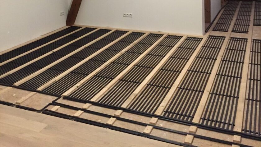 Dank aquatherm black fand die Familie auch eine Lösung für das statische Problem in der ehemaligen Scheune: Statt der nicht möglichen Estrichschicht samt klassischer Fußbodenheizung wurde auf dem alten Fußbodengewölbe neben einer Dämmung ein Boden aus OSB-Verlegeplatten montiert, auf die das Flächenheiz- und Kühlsystem geschraubt wurde.