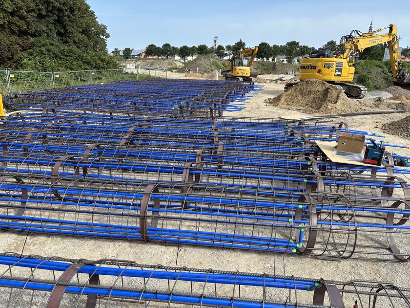 Bohrpfähle, die bis auf den tragfähigen Boden reichen und den Baugrund des Gebäudekomplexes sichern, wurden thermisch aktiviert. aquatherm blue kam in Geothermiesonden – vorgefertigt im Werk - zum Einsatz.
